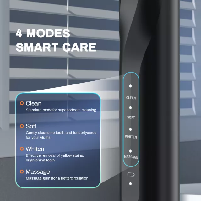 Transform your daily brushing into a deep-cleaning experience with this Advanced Sonic Electric Toothbrush. Engineered with a high-performance motor that produces an impressive 44,000 vibrations per minute, this toothbrush ensures that every corner of your mouth is thoroughly cleaned, helping to remove up to 99.99% of plaque and stains. With four specialized brushing modes—Clean, Soft, Whiten, and Massage—you can easily customize your brushing routine to meet your unique oral health needs.